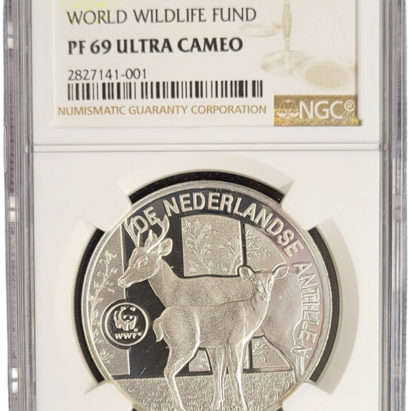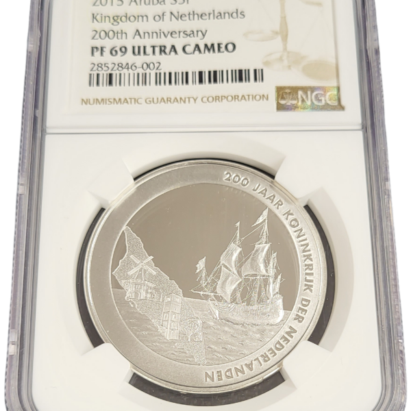 Dit is een door de NGC gecertificeerde en geslabte zilveren 5 florin 2015 proof van Aruba van 11,9 gram (925/1000 zilver). Het onderwerp is het zilveren regeringsjubileum van Koningin Beatrix. De door NGC bepaalde kwaliteit is PF69 UCAM. Bij NGC zijn er 2 munten in deze kwaliteit. Bij NGC zijn er geen hogere kwaliteiten bekend. De totale oplage van deze munt is 3.100 stuks.
