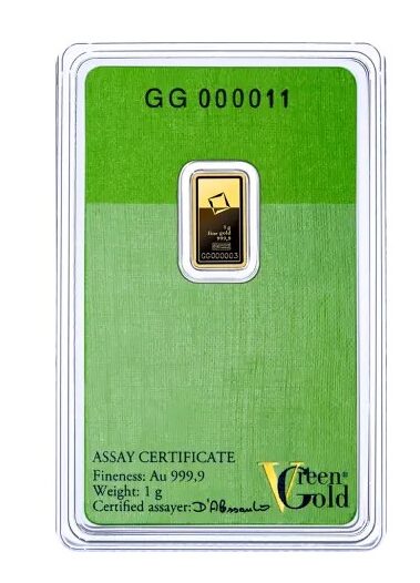 Dit is een bijzondere variant van de 1 gram Valcambi Goudbaar namelijk de “green” versie.