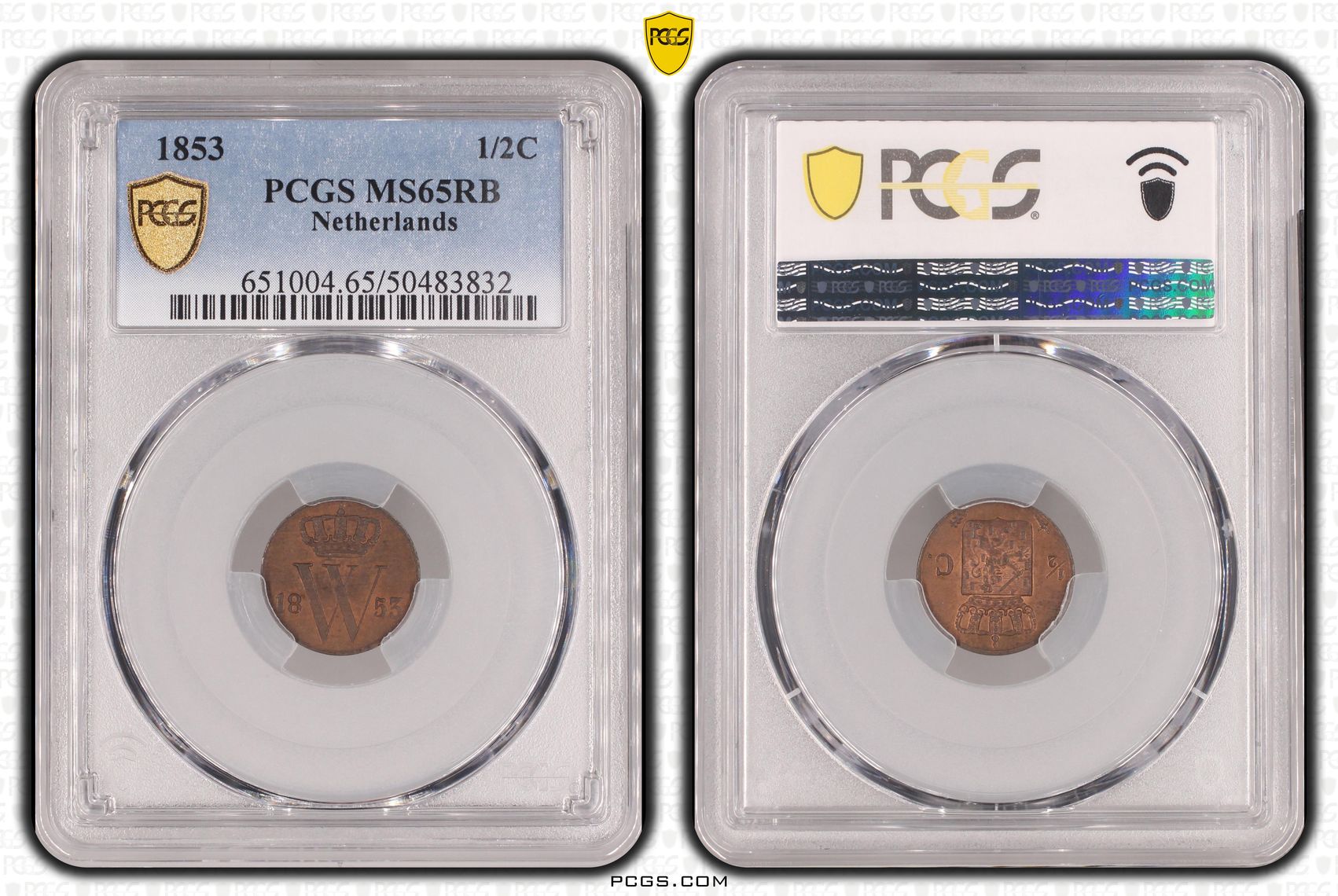 Deze koperen 1/2 cent 1853 van Koning Willem III is door PCGS gecertificeerd met de kwaliteit MS65 RB (Red Brown). Dit exemplaar is de hoogst gegradeerde binnen de PCGS-populatie, met Top Pop 1/0 – er bestaat dus geen enkel exemplaar in een hogere kwaliteit.