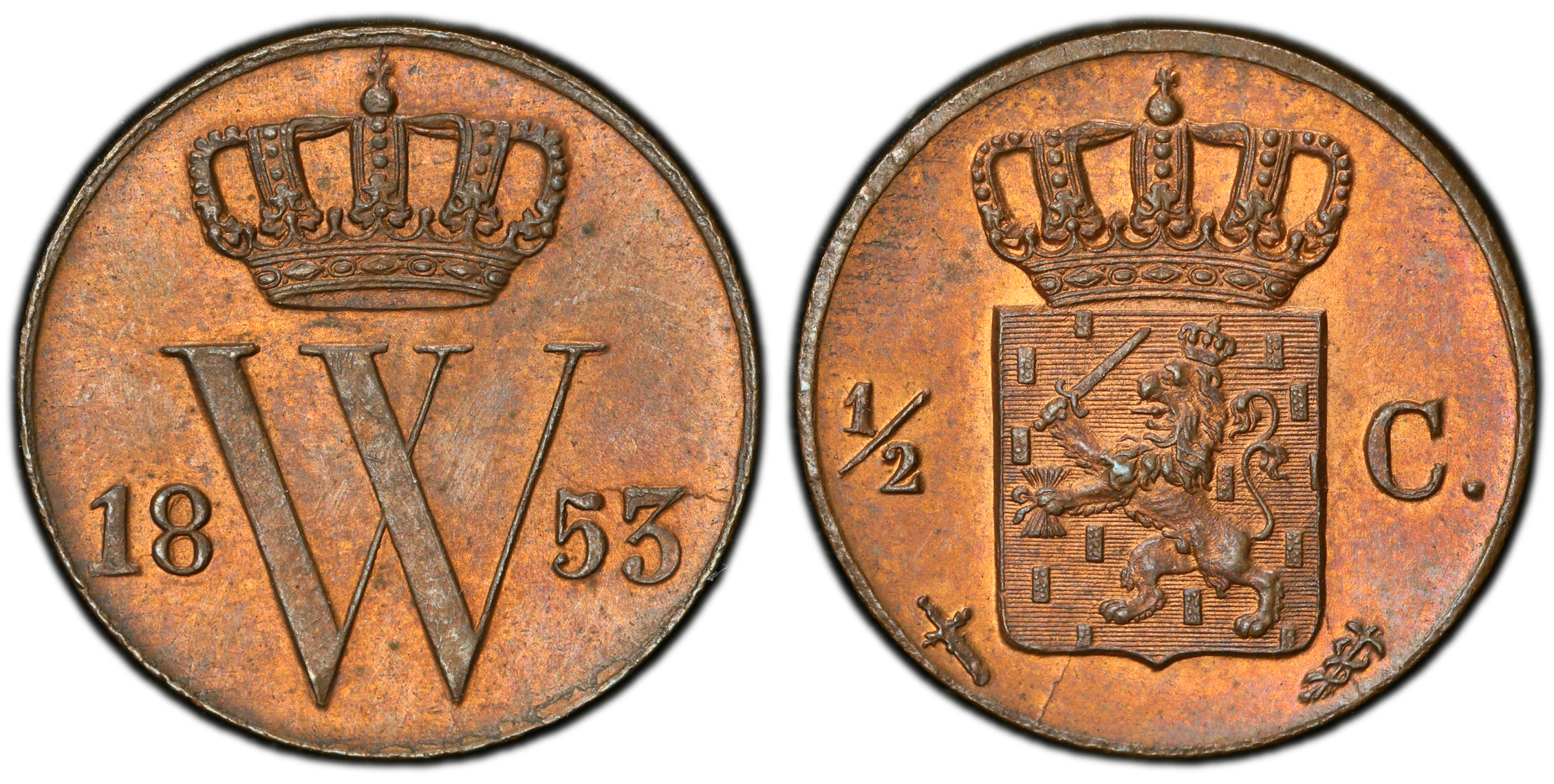 Koning Willem III 1/2 cent 1853 MS65 RB PCGS gecertificeerd (Top pop 1/0)