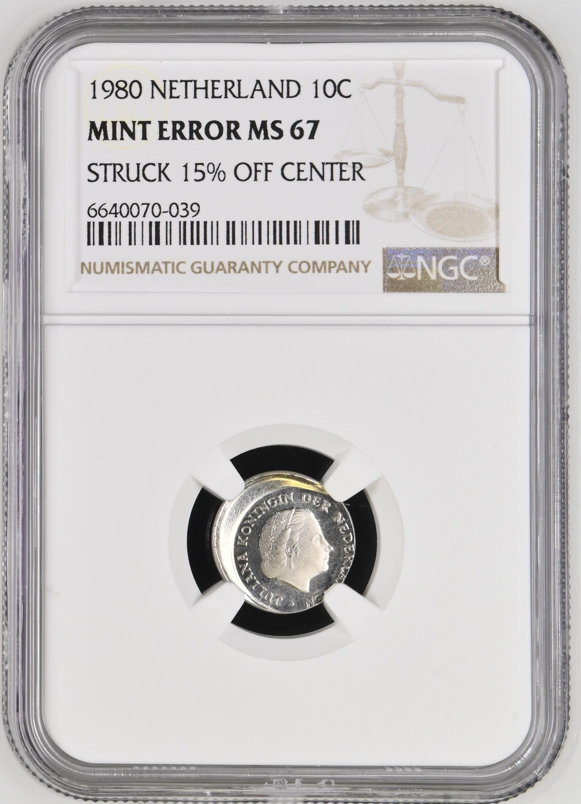 Deze 10 cent 1980 van Koningin Juliana is een zeldzaam exemplaar met een 15% off-center misdruk, gecertificeerd door NGC in MS67. Binnen de NGC-populatie is dit het enige exemplaar in deze kwaliteit, wat het een Top Pop maakt. Het betreft een nikkel munt met een gewicht van 1,5 gram en een diameter van 15 millimeter .