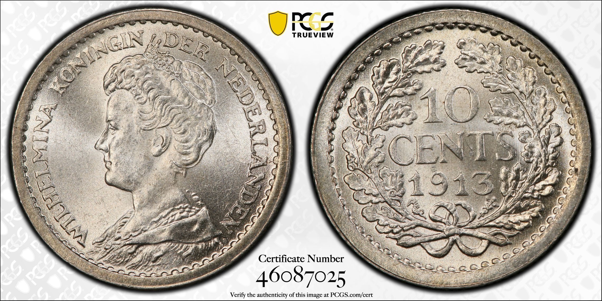Koningin Wilhelmina 10 cent 1913 PCGS MS65 (pop 4/1)