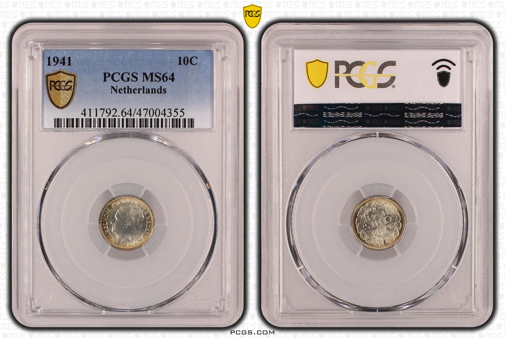 Dit is een door de PCGS gecertificeerde en geslabde zilveren 10 cent 1941 van Koningin Wilhelmina. De door PCGS bepaalde kwaliteit is MS64. Bij PCGS zijn er 11 munten in deze kwaliteit geslabd. Er zijn door PCGS 51 munten geslabd in een hogere MS score. Deze munten hebben een aantrekkelijke patina.