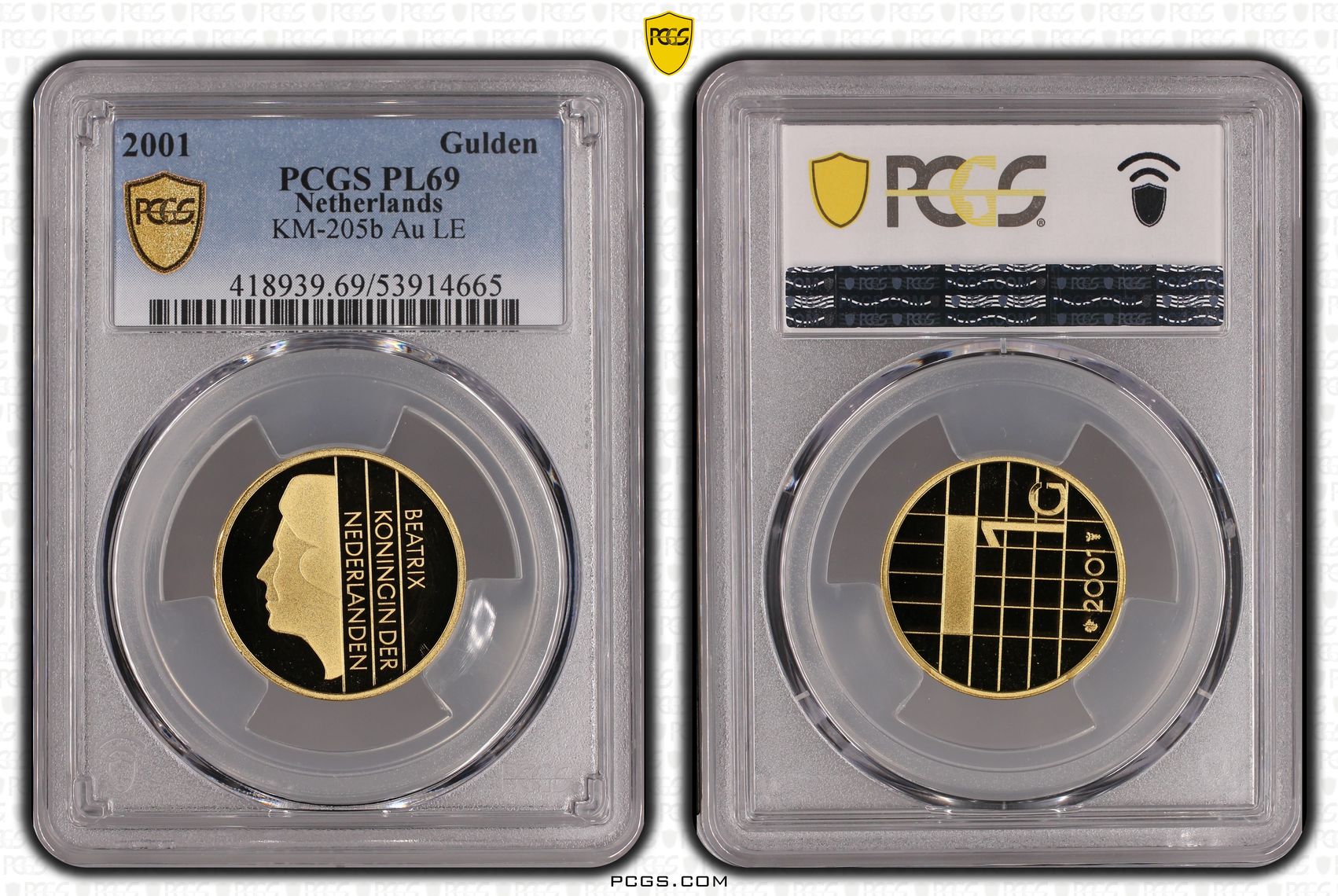 Dit is een door de PCGS gecertificeerde en geslabte gouden 1 gulden 2001 van Koningin Beatrix. De laatste reguliere gulden in goudafslag. De door PCGS bepaalde kwaliteit is PL69 (Prooflike). Bij PCGS zijn er 13 munten gecertificeerd in PL69. Bij PCGS zijn er 4 munten gecertificeerd in PL70.