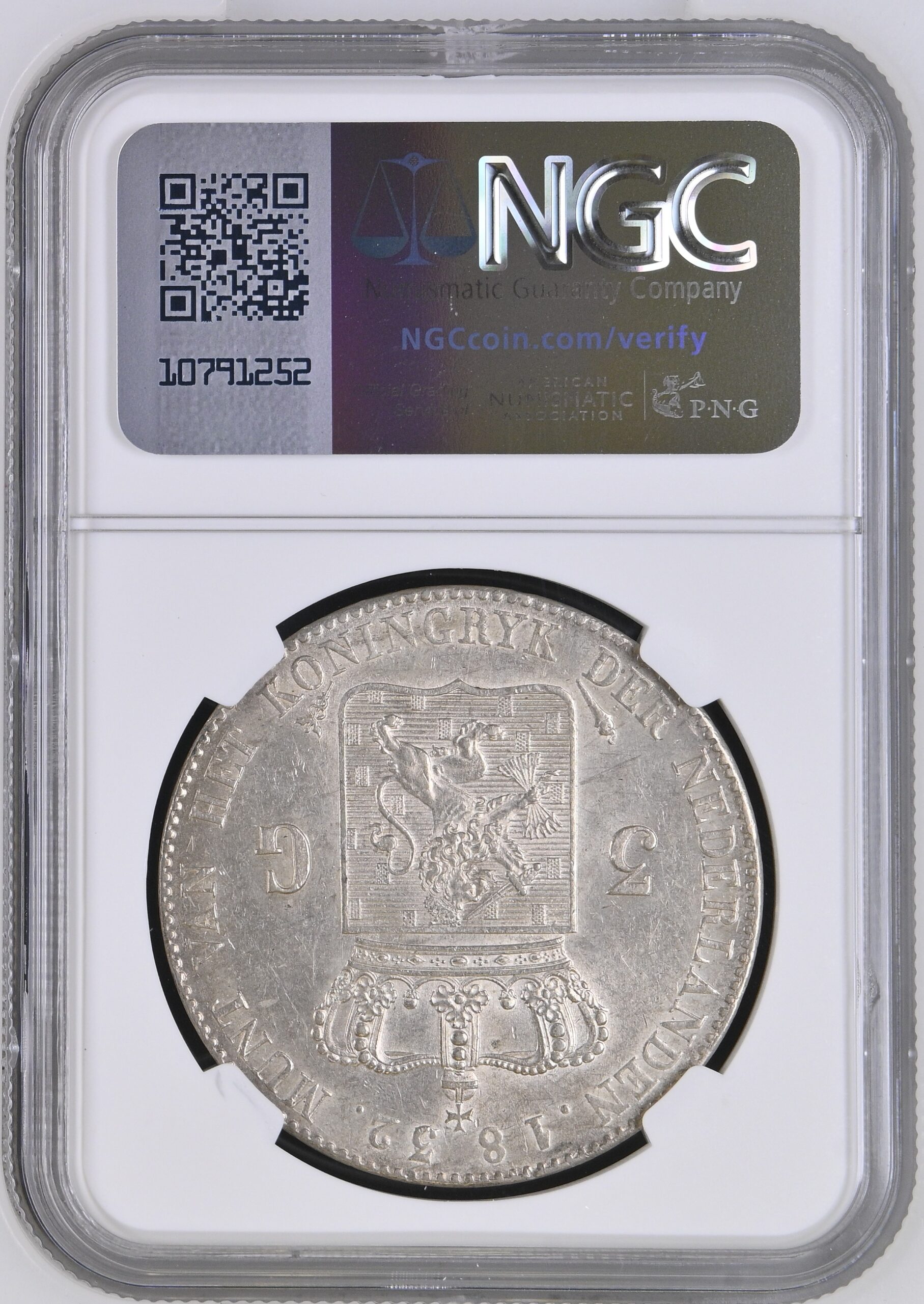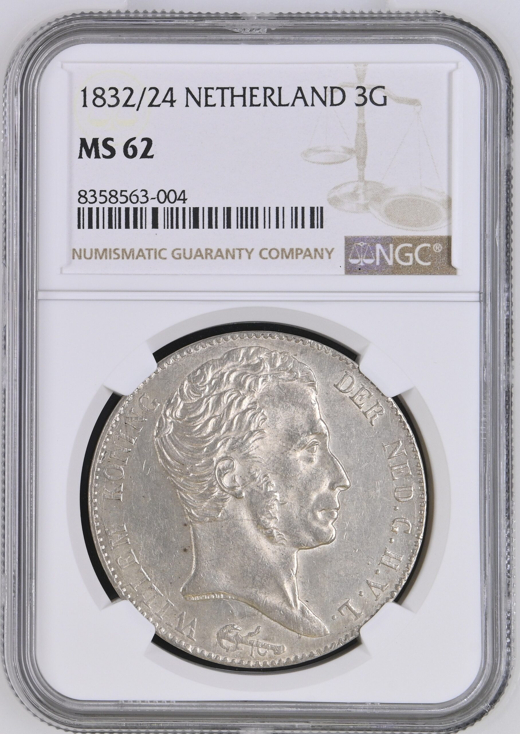 De 3 gulden 1832/24 overslag over ouder jaar is gecertificeerd als MS62, wat enorm hoog is voor een 3 gulden stuk. Er zijn 3 exemplaren gecertificeerd als MS62 en 3 hoger door NGC (allen MS63). Het certificaatnummer is 8358563-004. U kunt de authenticiteit en beoordeling ervan verifiëren via de volgende link: NGC LINK.