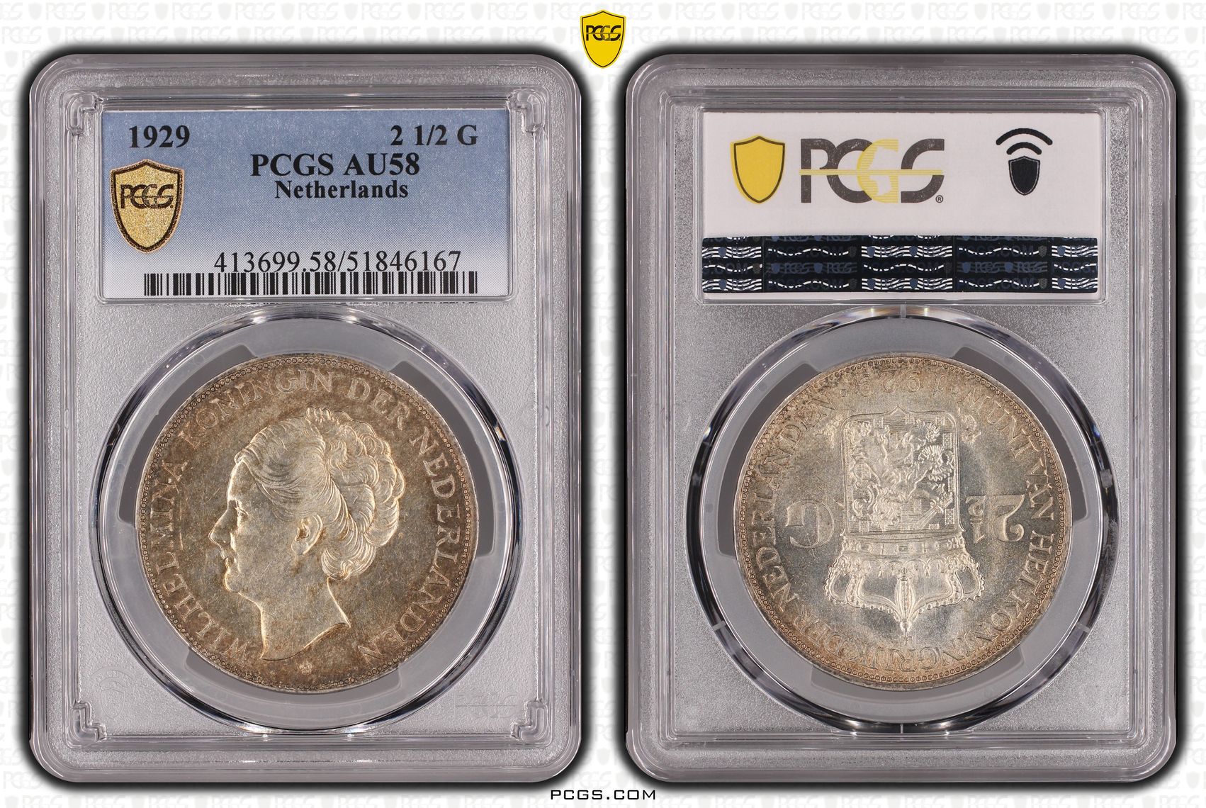 Deze zilveren 2 1/2 gulden 1929 van Koningin Wilhelmina betreft het eerste jaar van uitgifte van dit type. Het exemplaar is door PCGS gecertificeerd en geslabd in de kwaliteit AU58. In deze kwaliteit zijn slechts 2 munten bekend bij PCGS, met 10 stuks die in een hogere kwaliteit zijn gegradeerd.