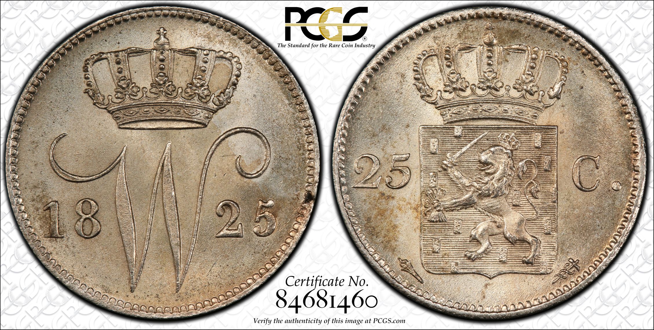 Koning Willem I 25 Cent 1825 Utrecht – PCGS MS65 – Zeldzaam in Topkwaliteit (Pop 4/4)
