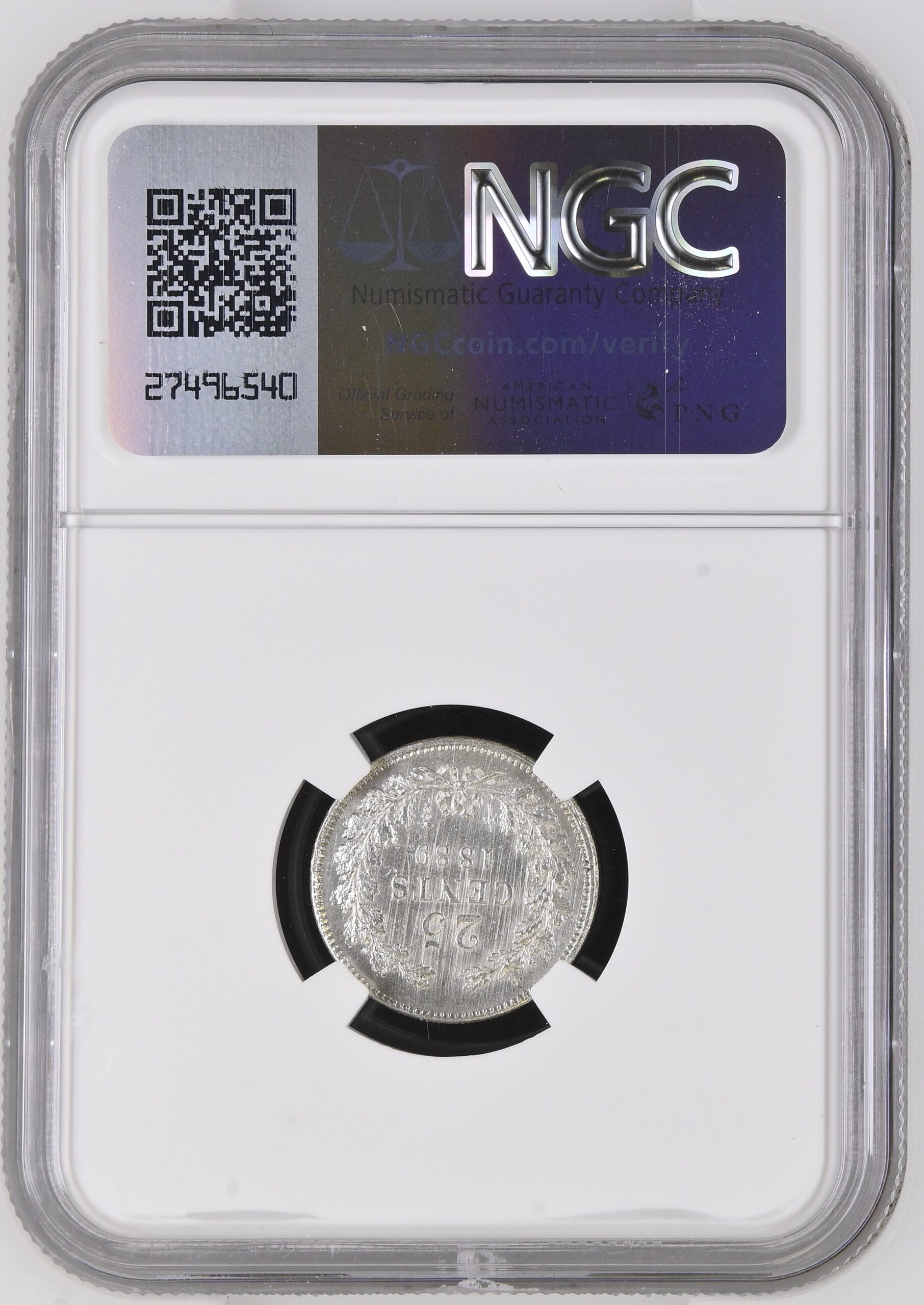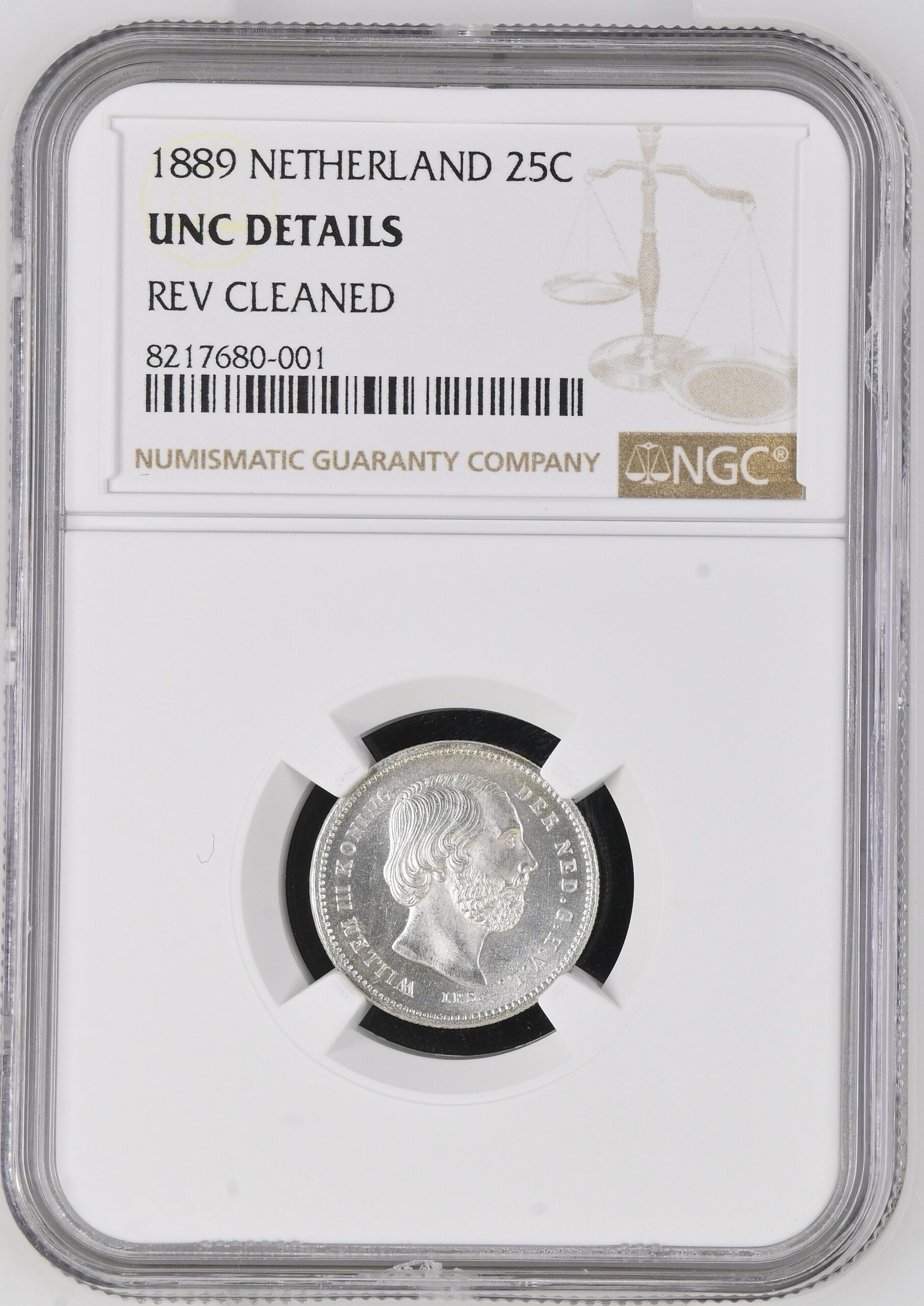 Deze 25 cent 1889 van Koning Willem III is gecertificeerd door NGC met de aanduiding UNC Details. Dit betekent dat de munt in ongecirculeerde kwaliteit verkeert, maar dat deze is schoongemaakt. Ondanks de opmerking over reiniging is het een aantrekkelijk exemplaar met alle details scherp aanwezig.