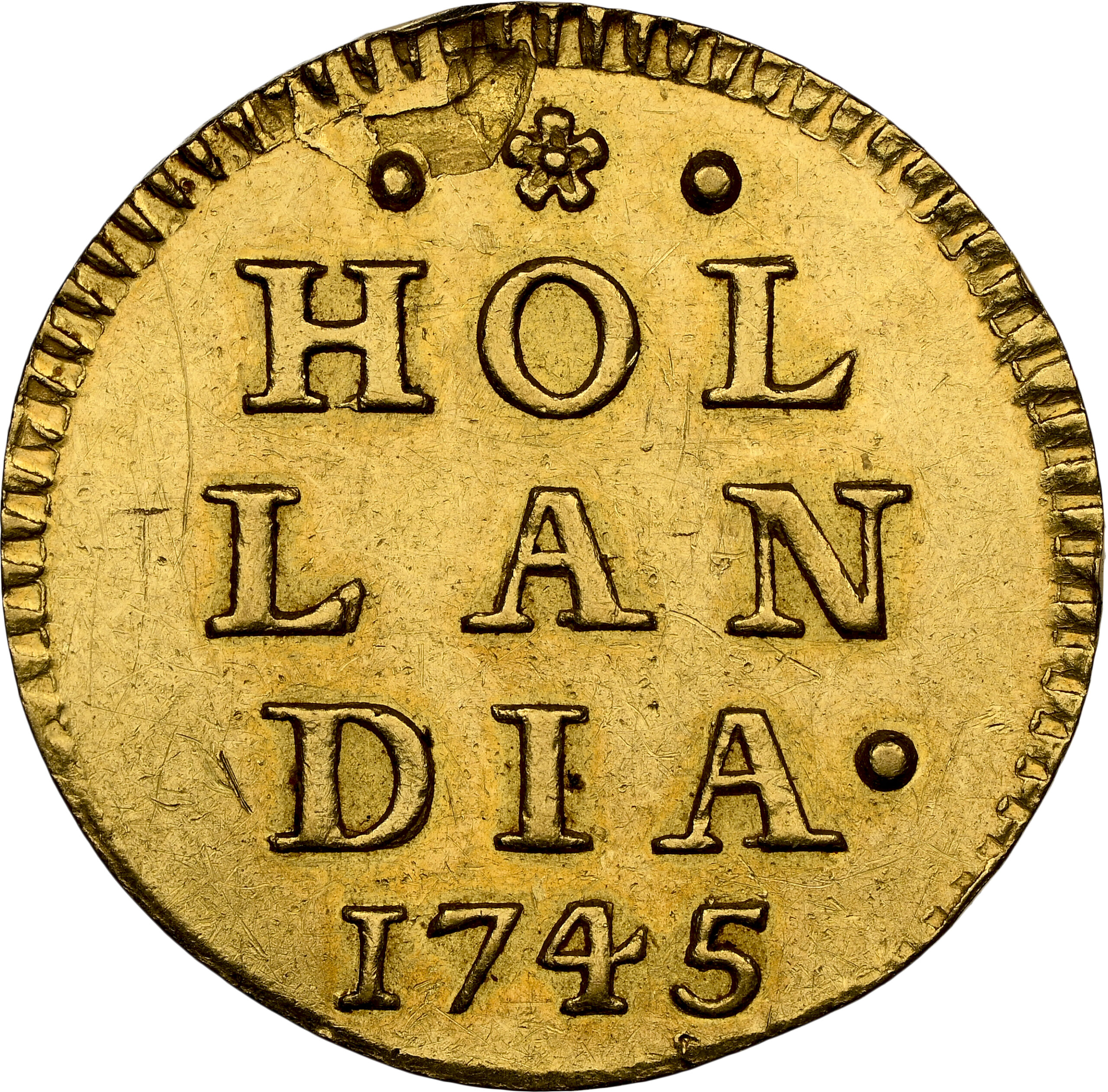 Een uitzonderlijke vondst binnen de Nederlandse numismatiek: deze Pijl- of Bezemstuiver 1745 van de Provincie Holland is geen reguliere uitgifte, maar een uiterst zeldzame afslag in goud. Waar stuivers uit deze periode normaliter in zilver werden geslagen, betreft dit een speciale afslag,  vervaardigd in beperkte oplage voor representatieve of ceremoniële doeleinden.