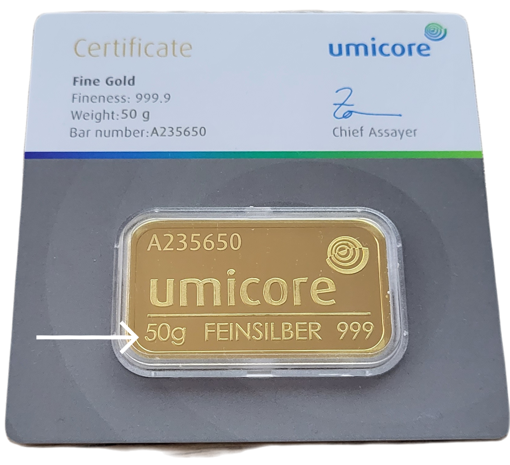 Deze Umicore 50 gram goudbaar heeft een zuiverheid van 999.9 en heeft een “Good Delivery”  status. Op deze goudbaar vind u ook het officiële “Umicore Feinsilber, wat nogal opmerkelijk is. Kennelijk is men tijdens productie vergeten de stempels te wisselen, een zeer bijzondere baar die u amper tegen zult komen.