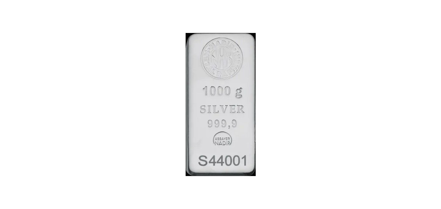 Deze 1 kg Nadir zilverbaar bevat een zilvergehalte van 99,99% . Deze zilverbaar weegt 1000 gram.