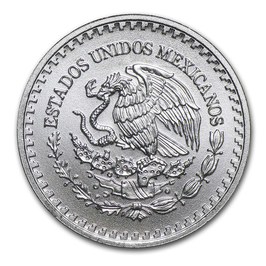 • Keerzijde: toont twee sleutelsymbolen van het Mexicaanse volk: het standbeeld van de gevleugelde overwinning op de voorgrond en de Mexicaanse vulkanen Popocatepetl en Iztaccíhuatl op de achtergrond.
