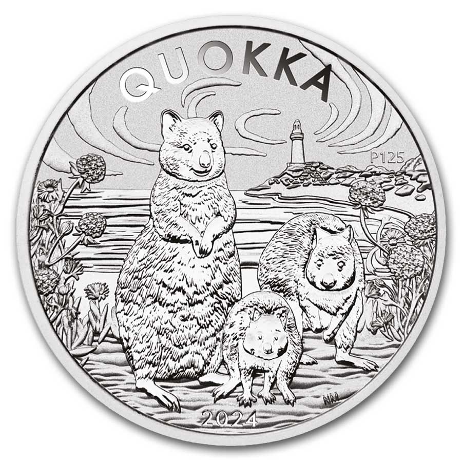 Dit vrolijke familielid van de kangaroo genaamd Quokka staat bekend om zijn goedlachse uitstraling.  De 1 oz munt van de Perth Mint komt uit 2024.