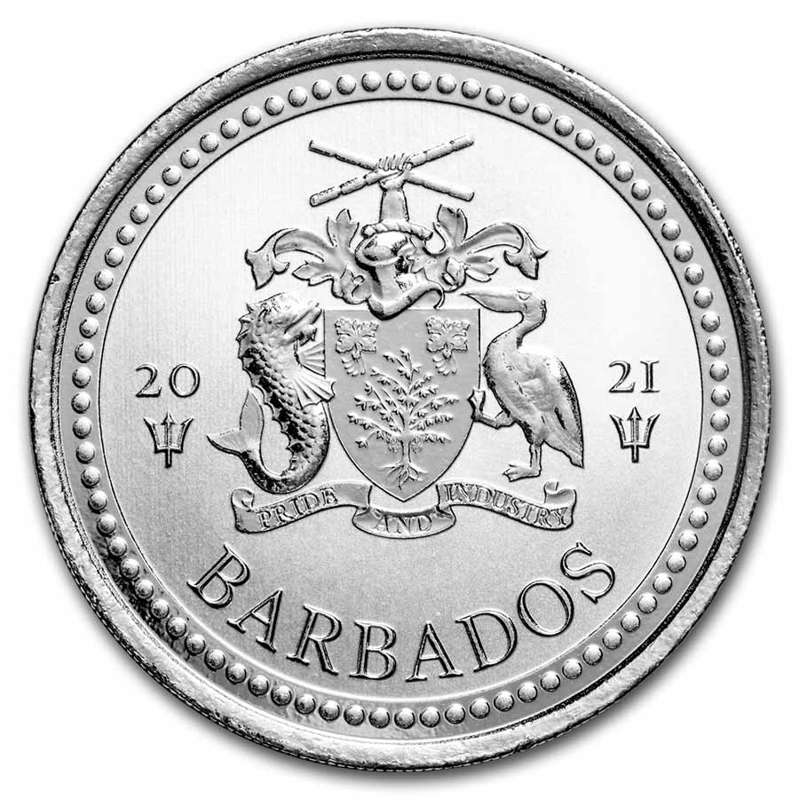 Deze prachtige munt, de Barbados Trident 1 oz 2021 is geproduceerd in opdracht van de Centrale Bank van Barbados. De producent is de Scottsdale Mint. Deze munten zijn in Barbados wettig betaalmiddel (one dollar). De munten wegen 31,1 gram en bevatten 99,9% zilver. De munten zijn in een oplage van 30.000 stuks verschenen.
