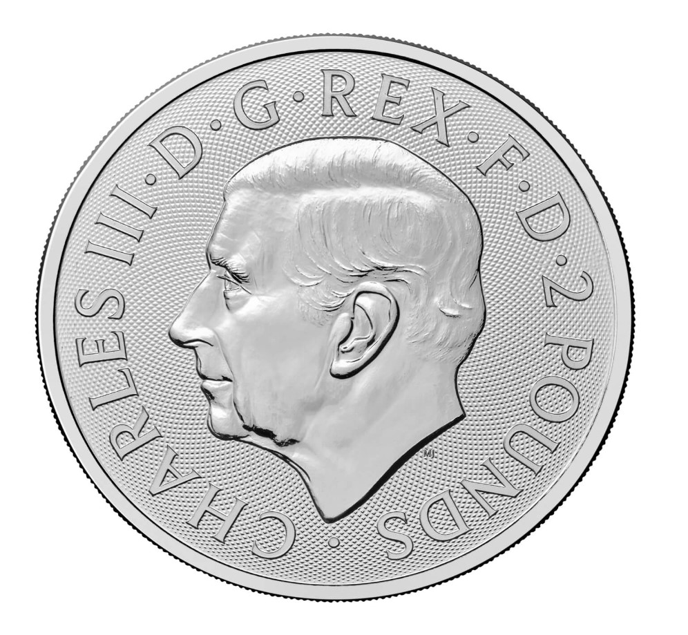 • Op de voorzijde staat het muntportret van Zijne Majesteit Koning Charles III door Martin Jennings